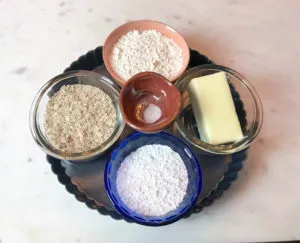 - Using a mixer, combine butter and sugar until fluffy. Add flour, almond meal, and salt. Mix well.