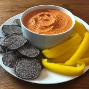 I sliced up yellow bell peppers to increase the good pepper flavor but also got great chips at Trader Joe’s – their organic blue corn tortilla chips with sprouted amaranth, quinoia, and chia seeds. A nice hearty chip for a robust and smooth hummus dip!