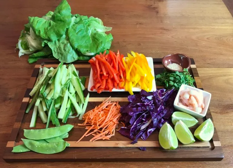 • Fill the bottom one third of the wrapper with a little of each of the vegetables. Place a piece of lettuce and top with 4 pieces of shrimp. Squeeze lime juice over the top and begin rolling tightly from the bottom, tucking in edges. Repeat with other wrappers.